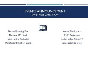We are pleased to announce the dates for our two major events in 2019. National Indexing Day will take place on Thursday 28 March 2019. There will be a range on online activities and you can join in on social media with #indexday. Following the success of our half-day event for publishers in London for