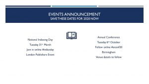 We are pleased to announce the dates for our two major events in 2020. National Indexing Day will take place on Tuesday 31st March 2020. There will be a range of online activities and you can join in on social media with #indexday. We will be running a half-day event for publishers in London. Further