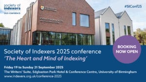 We are delighted to announce that booking is now open for the Society of Indexers 2025 in-person conference, ‘The Heart and Mind of Indexing’, at Edgbaston Park Hotel and Conference Centre, University of Birmingham, Friday 19 to Sunday 21 September. Details on the programme timetable, session content, venue and accommodation, booking and payment information are now