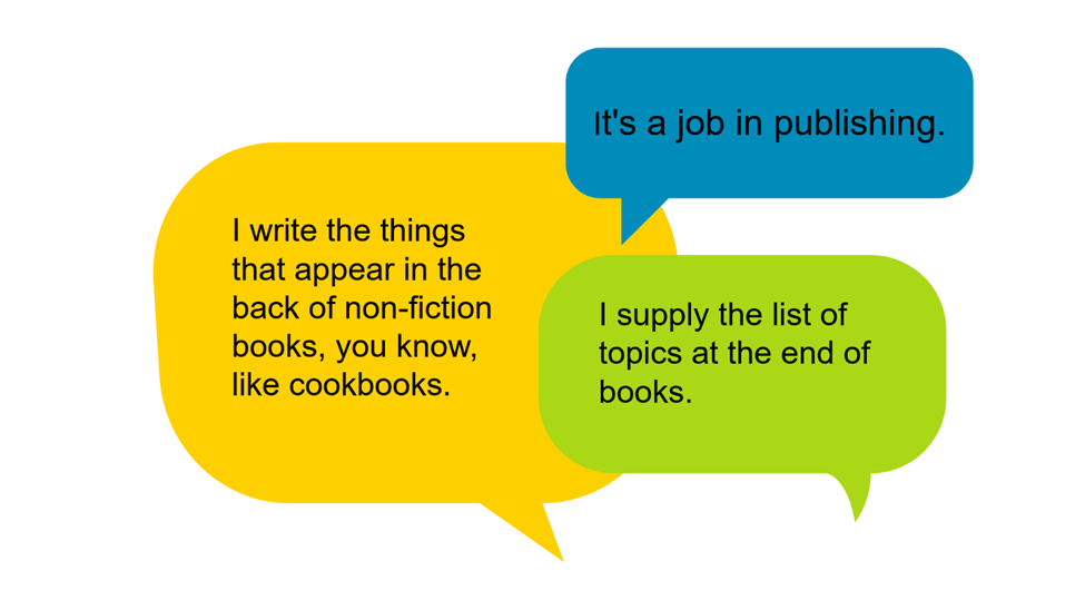 Firstly, quite a surprising number of us reported that when we tell people that we’re indexers, they look blankly at us and ask ‘What’s that?’ What we say in reply: