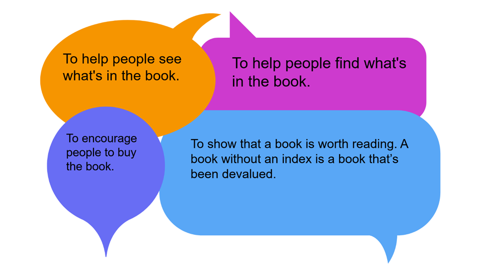 Which brings me to the last question that was discussed at our meeting, but also perhaps to the most important that we are ever asked: ‘Why does my book need an index?’ We say: